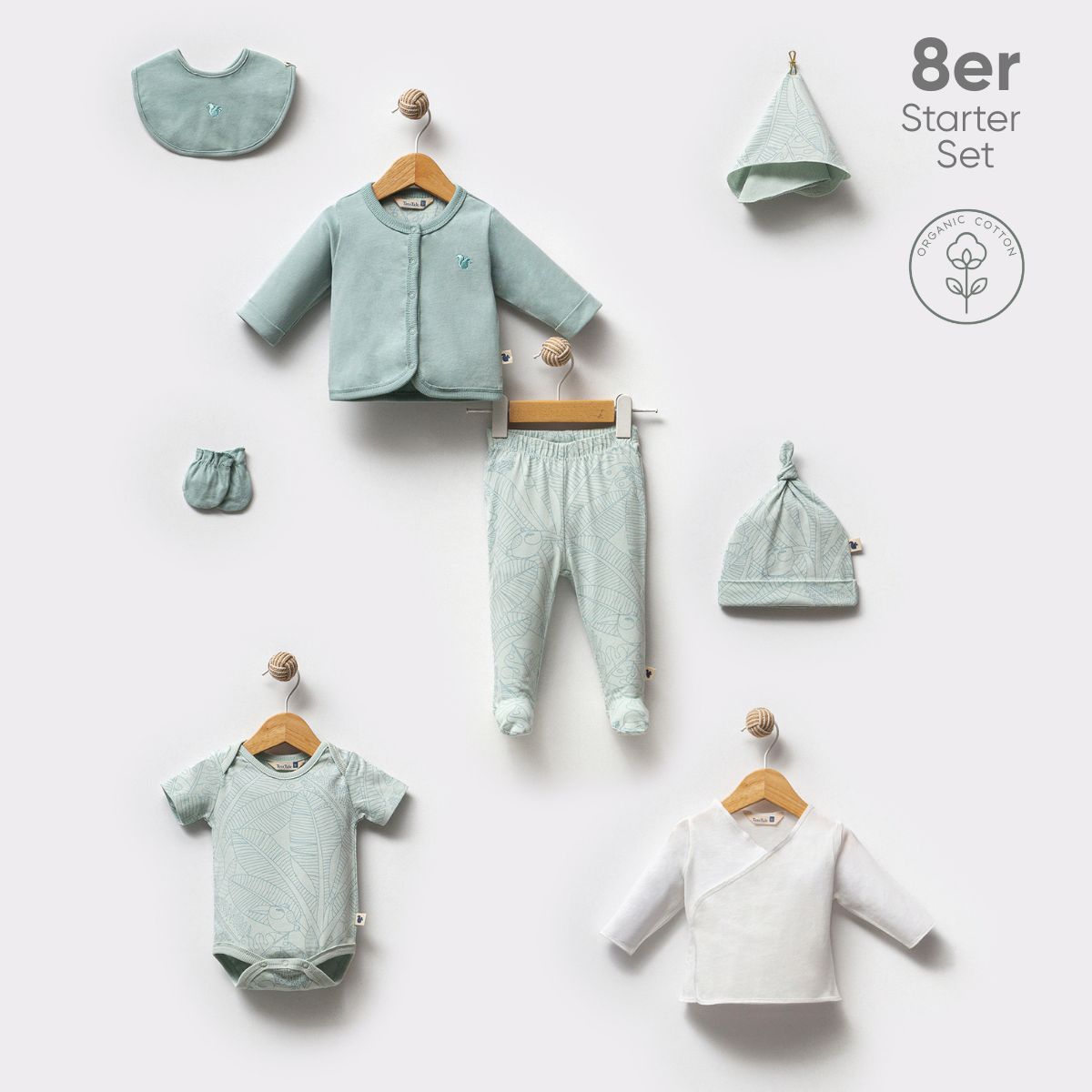 8-piece starter set for newborns made from certified organic cotton. With hat, inner garment, jacket, bodysuit, mittens, burp cloth, bib and trousers - everything you need for the first few days.